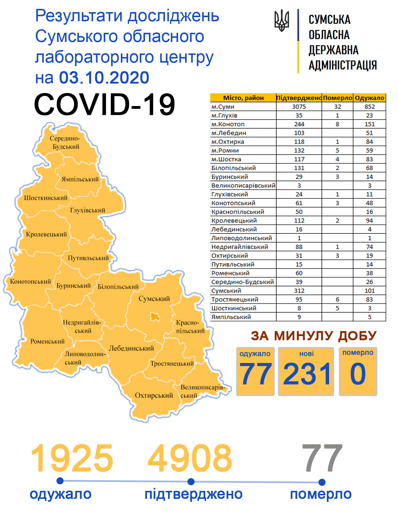 За минувшие сутки Covid-19 подтвердили в 231 особb: Сумы – 178, Шостка – 1, Конотоп – 10, Ромны – 9, Ахтырка – 3, Глухов – 2, Лебедин – 6, Белопольский р-н – 2, Белопольский р-н – 1, Краснопольский р-н – 2, Ахтырский р-н – 1, Белопольский р-н – 1, Сумской р-н – 13, Тростянецкий р-н – 2.