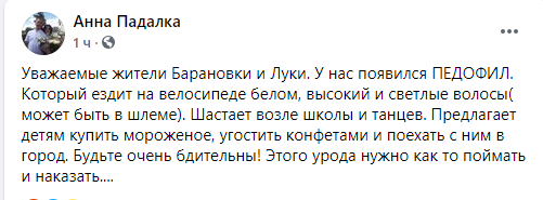 «Уважаемые жители Барановка и Луки. У нас появился педофил. Который ездит на велосипеде белом, высокий и светлые волосы (может быть в шлеме). Шастает возле школы и танцев. Предлагает детям купит мороженое, угостить конфетами и поехать с ним в город. Будьте очень бдительны! Этого урода нужно как то поймать и наказать ….» – говорится в сообщении Анны.
