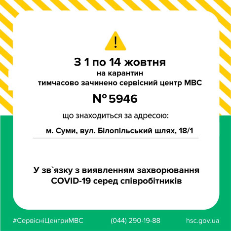Сервисный центр МВД №5946 в г. Сумы с 1 по 14 октября закрыто из-за обнаружения заболевания COVID-19 в сотрудников.