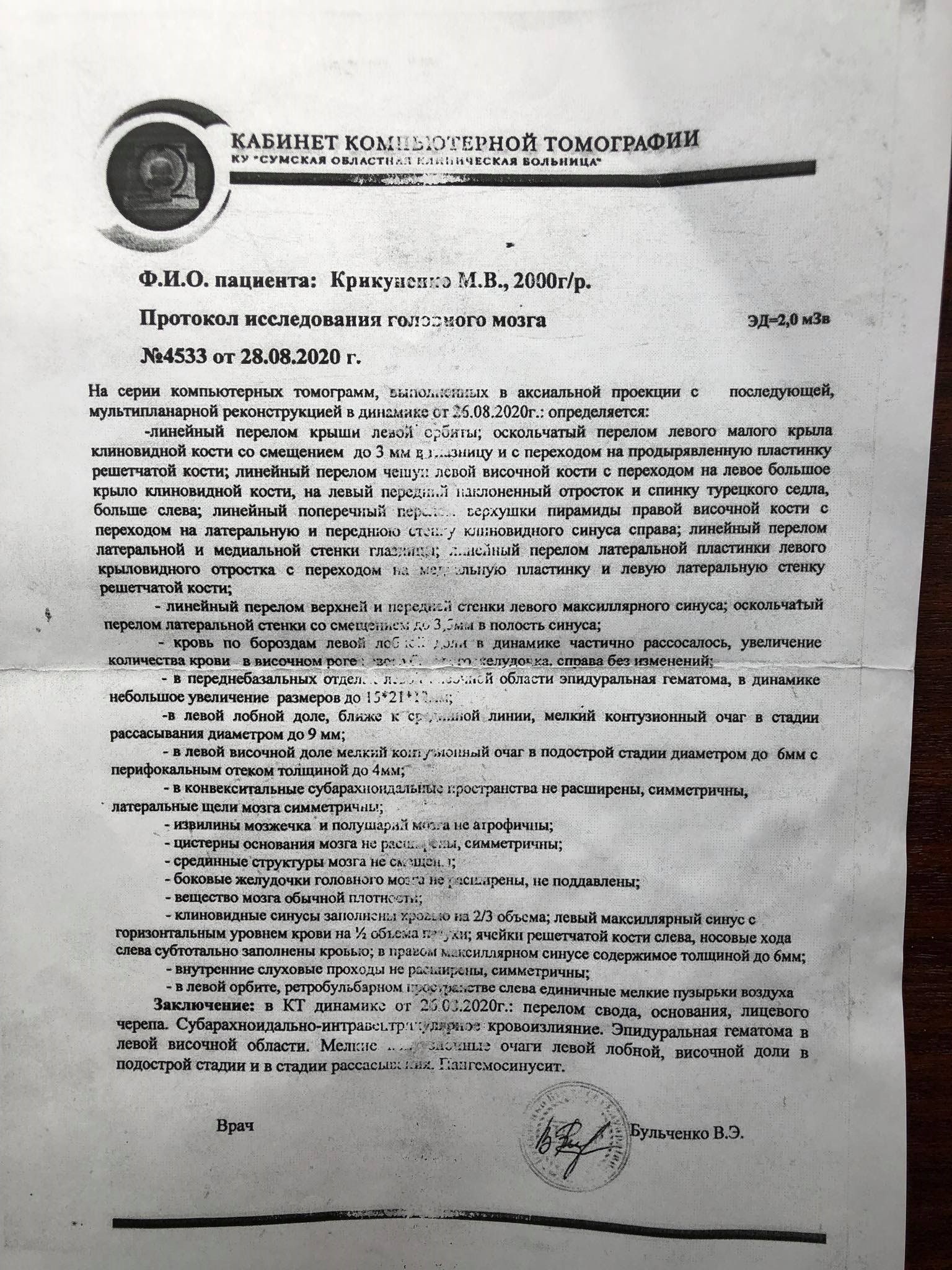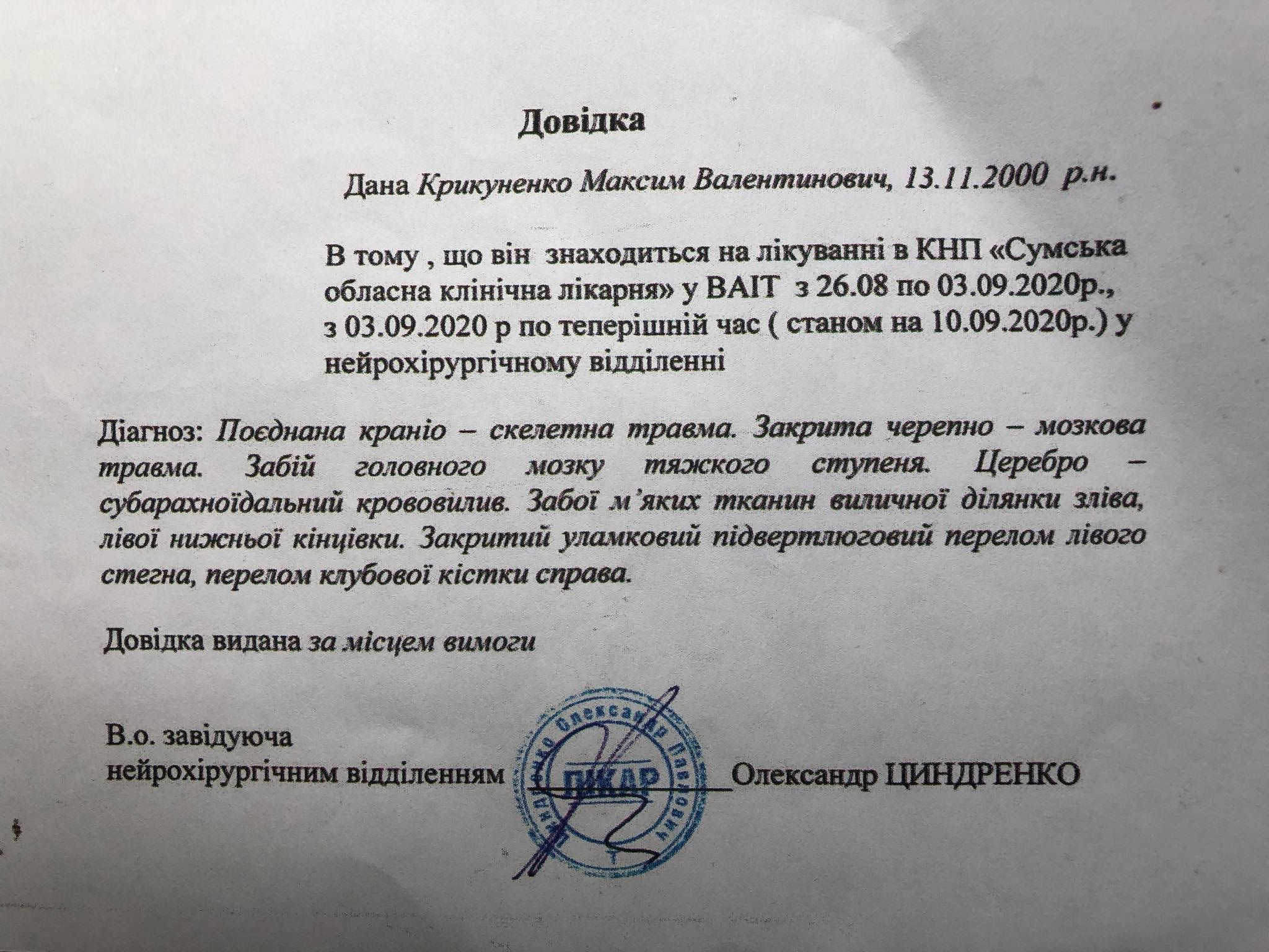 Сейчас парень находится в нейрохирургическом отделении Сумской городской клинической больницы с диагнозом “Совмещенная краниоскелетна травма. Закрытая черепно-мозговая травма. Ушиб головного мозга тяжелой степени. Церебро-субарахноидальное кровоизлияние. Ушибы мягких тканей скуловой области слева, левой нижней конечности. Закрытый оскольчатый пидвертлюговий перелом левого бедра. Перелом подвздошной кости справа “.