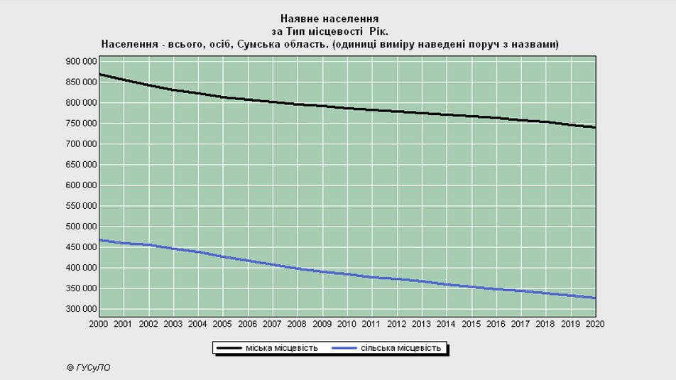 В начале 2001 года на Сумщине проживало 1336900 человек, из них 35% проживали в селах. За 20 лет население сократилось на 268 653 человека. При этом, 31% от всего имеющегося – проживает в селах.