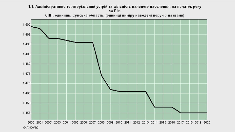 Количество сел на Сумщине постоянно уменьшается, а в тех, что остаются, постепенно уменьшается количество населения. По информации официального сайта Верховной Рады Украины, за последние 10 лет с карты Сумщины исчезли 11 сел, а за последние 20 лет – 45. За 2019 населения Сумщины сократилось почти 11000 человек.